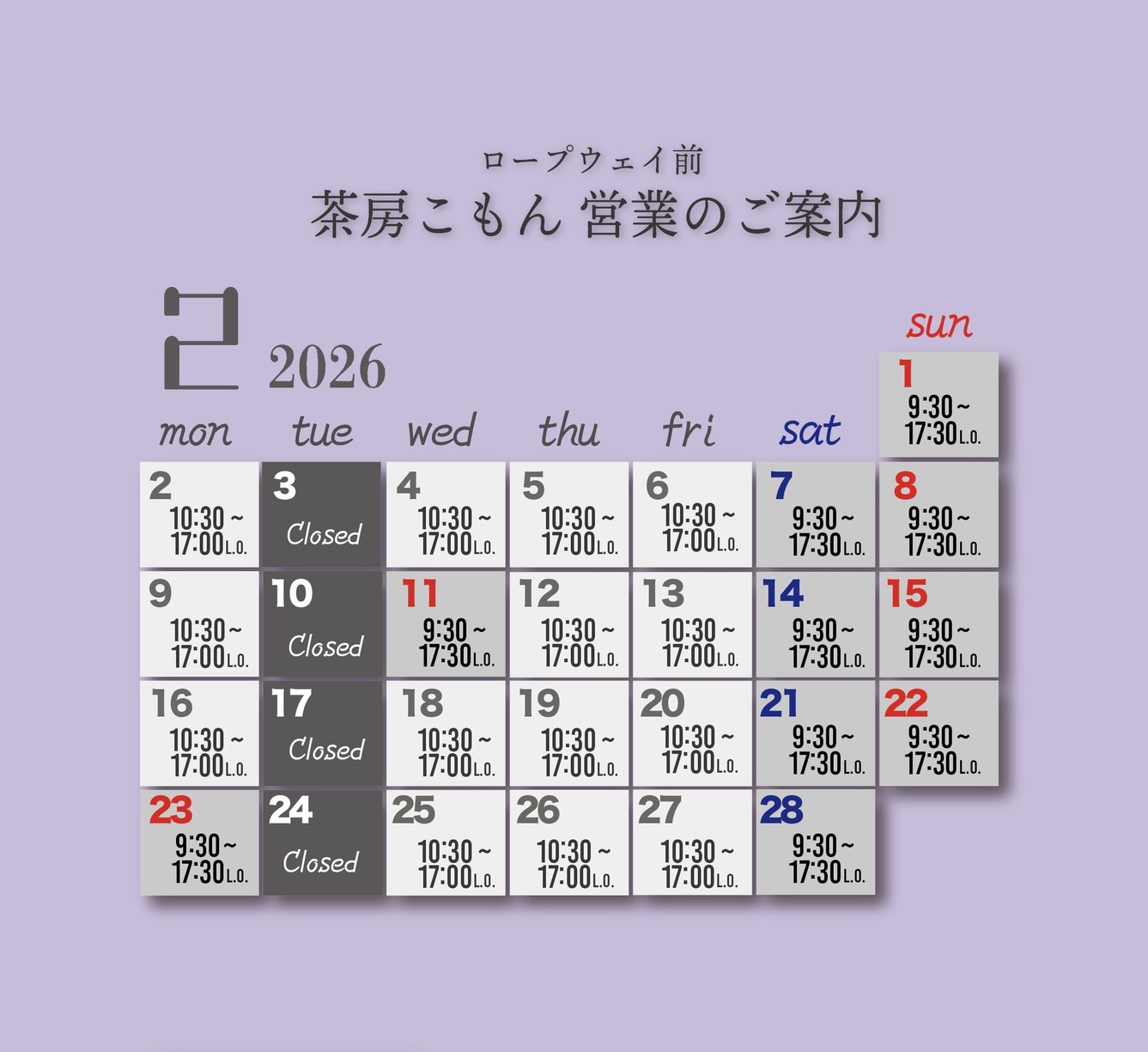 1/4・1/5 9:30〜18:00(L.O.17:30)